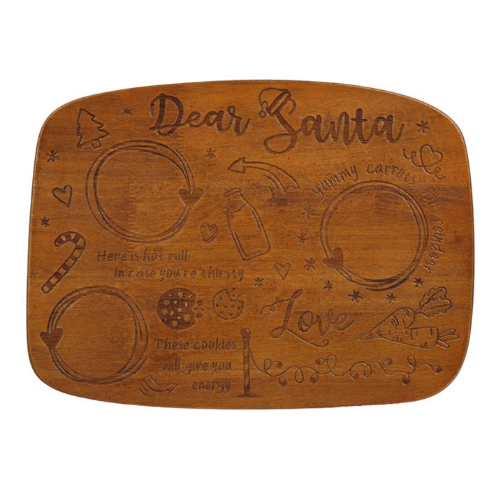 Prepare treats for Santa and his reindeer with this mango wood Christmas Eve serving board. Features dedicated places for Santa’s milk and cookies (plus carrots for his crew), making it the perfect piece to add some festive cheer to Christmas Eve traditions. Hand wash.