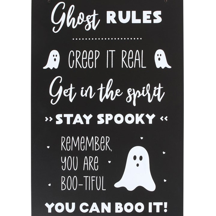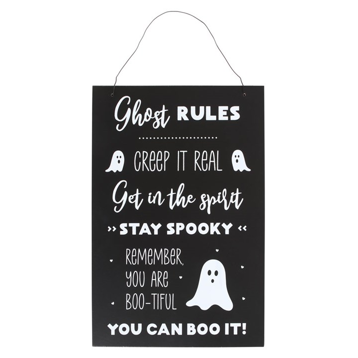 Get spooky this Halloween with a fun hanging sign perfect for ghosts of all sizes. Features ‘Ghost Rules’ and ‘Creep it real. Get in the spirit. Stay spooky. Remember, you are boo-tiful. You can boo it!’ text finished with three friendly ghost graphics.