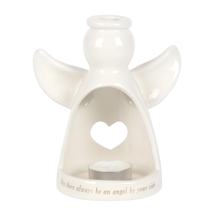 A white tealight holder shaped like a sweet angel with a heart-shaped cut out. Features gold ‘May there always be an angel by your side’ text that is sure to bring comfort and reassurance to those in need of an extra dose of care.Product Dimensions: H15cm x W13cm x D9cm Packaged Dimensions: H15.6cm x W11.5cm x D10.6cm