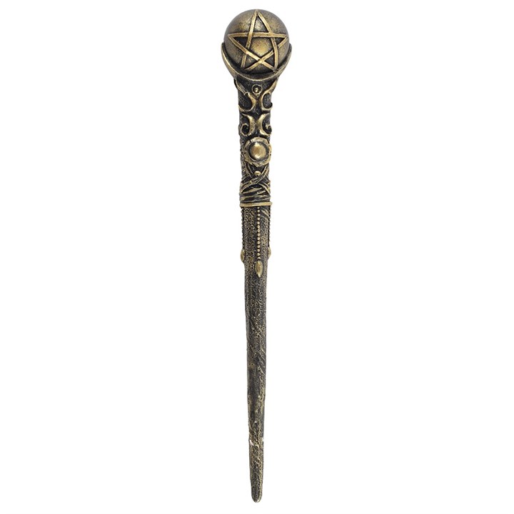 This 24cm resin wand features a bronze orb with pentagram symbol sitting atop an ornate and detailed wand stem. Elegant and appealing, this magic wand is a necessity for any witch or wizard’s collection. This wand is not a toy and should be handled with care. Product Dimensions: H24cm x W3cm x D3cm Packaged Dimensions: H27.5cm x W6.5cm x D6.5cm