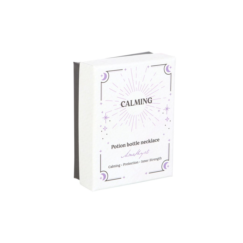 Give the gift of crystal magic with this miniature potion bottle necklace. With natural amethyst crystal chips and a cork stopper, this necklace serves as a spellbinding accessory while calming nervous energy and promoting inner strength. Presented in a matching gift box and perfect for that special witch in your life. Plastic bottle on a nickel-free stainless steel chain.