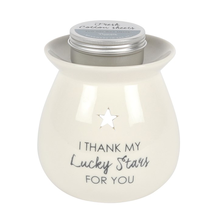 This wax melt burner gift set includes agrey-accented ceramic burner with cutout star and ‘I thank my lucky stars for you’ text. Includes a tin of Fresh Cotton Sheets eco soy wax melts in a lovely gift box and makes a lovely gift. Product Dimensions: H11cm x W11cm x D9cm Packaged Dimensions: H16cm x W12cm x D11.5cm
