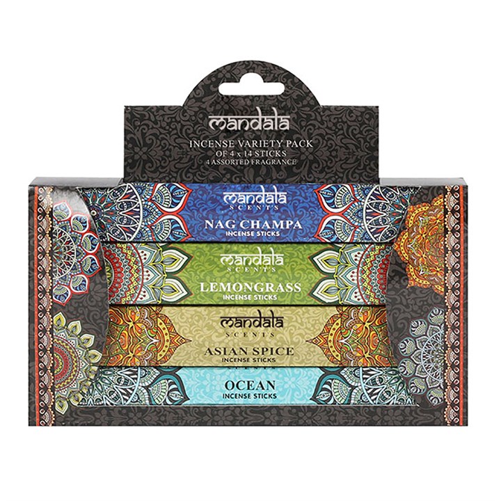 This gift set contains four packs of incense sticks in various fragrances and comes presented in a beautifully designed Mandala print box.