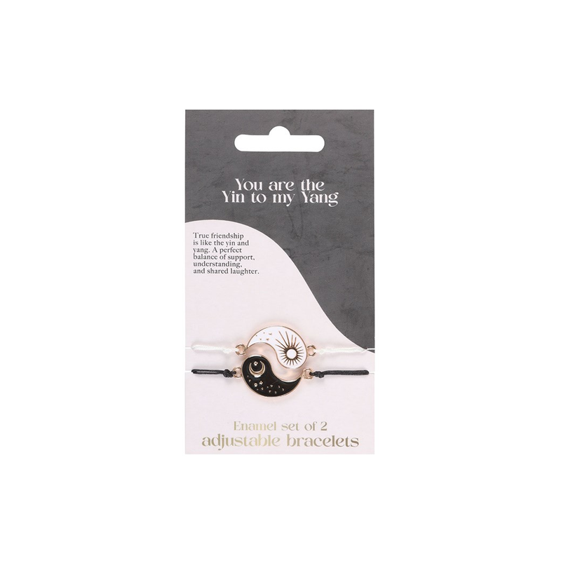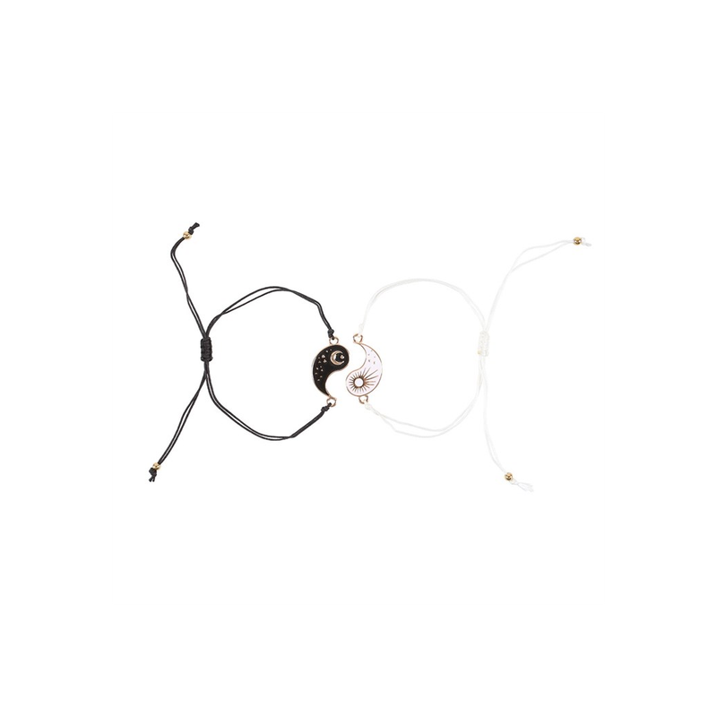 Celebrate the harmony of opposites with this pair of Yin and Yang bracelets, designed to be shared between two friends. Split between a sun and moon, this symbolic duo represents the balance of light and dark, a reminder that “You are the Yin to my Yang.” Nickel-free stainless steel charms. Adjustable fit.