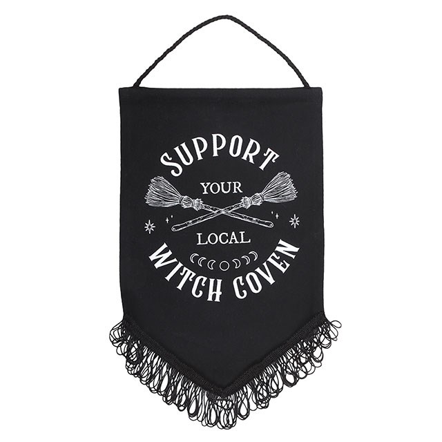 Make a statement with this gothic hanging fabric banner featuring the phrase ‘Support Your Local Witch Coven’ alongside a crossed broom design. Perfect for decorating altars, walls, or windows, it’s a fun piece for witches, practitioners, or lovers of all things magical.