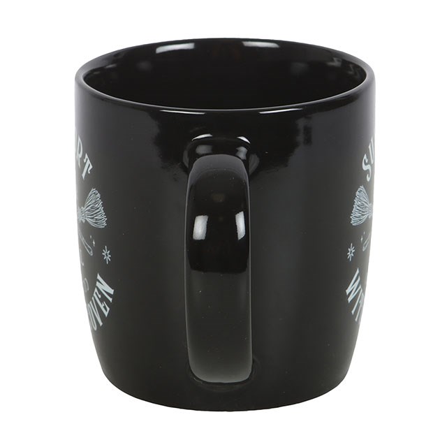 Show your support for all things magical with this black ceramic mug featuring crossed broomsticks and the phrase ‘Support Your Local Witch Coven’. A must-have for modern witches, mystical coffee lovers, and anyone who proudly backs their coven crew. 320ml capacity. Microwave safe. Dishwasher safe.