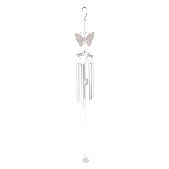 This silver and white windchime features a delicate resin butterfly at the top, with a spiral metal design that flows into a soft cascade of chimes and a clear hanging crystal at the base. Perfect for hanging in a sunny corner, it adds gentle movement and peaceful sound to spaces of remembrance or quiet reflection.